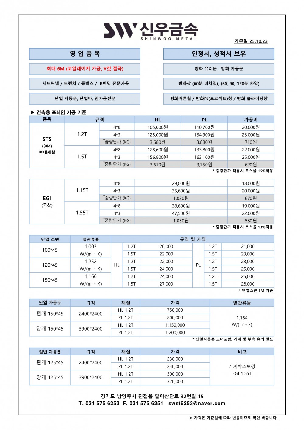 [2025년 10월 단가표] 절단/절곡/레이저/방화/단열 판매가격 ψ(`∇´)ψ❤ 페이지 정보 작성일 25-10-20 13:39 조회 361회 목록 본문 다음글[2025년 9월 단가표] 절단/절곡/레이저/방화/단열 판매가격 ψ(`∇´)ψ❤ 25.09.16