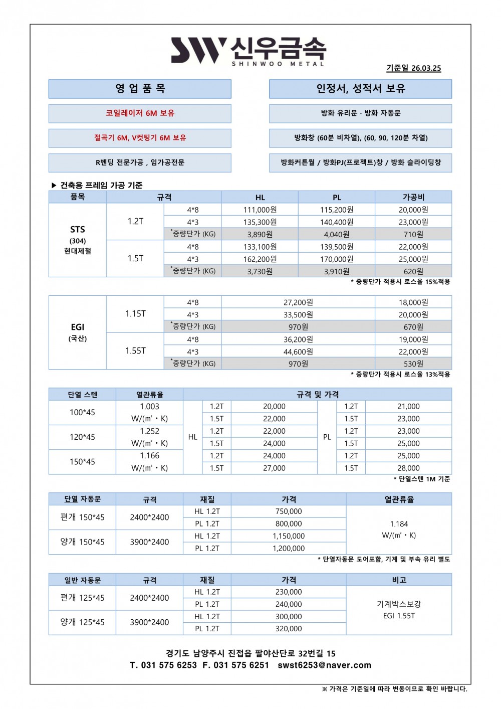 [2026년 3월 단가표-1] 절단/절곡/레이저/방화/단열 판매가격 ψ(`∇´)ψ❤ 페이지 정보 작성일 26-03-24 16:22 조회 38회 목록 본문 다음글[2026년 3월 단가표] 절단/절곡/레이저/방화/단열 판매가격 ψ(`∇´)ψ❤ 26.03.04